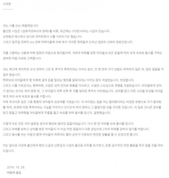 | ▲ (사진=배용제 사과문) | ||