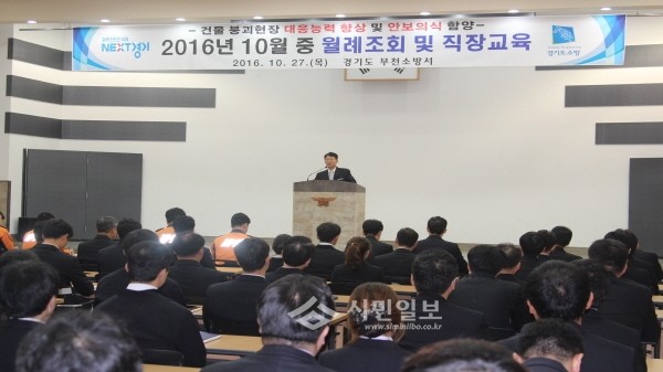 경기 부천소방서는 27일 오전 3층 대회의실에서 부천대학교 건축과 이상원 교수를 초빙해 직원을 대상으로 '건물 붕괴현장 대응능력 향상 교육'을 실시했다. 사진은 이 교수가 직원들에게 강연하는 모습.(사진제공=부천소방서)