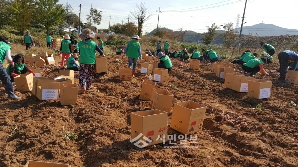 최근 인천 서구 새마을회는 새마을지도자 105명이 참여한 가운데 공촌동 휴경지와 시천동 공영도시농업농장 등 2300㎡ 규모 부지에서 고구마를 수확해 지역내 어려운 이웃에게 전달했다. 사진은 행사 참가자들이 고구마를 캐고 있는 모습.(사진제공=인천 서구청)