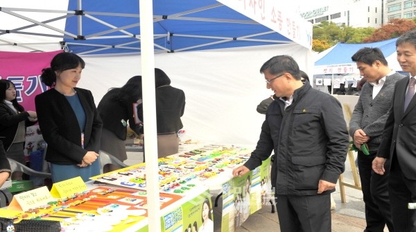 28일 서울 노원구는 중계근린공원에서 노원혁신교육 ‘마을이 학교다’ 박람회를 개최했다. 사진은 김성환 구청장(가운데)이 박람회에서 전시 미치 체험 부스를 둘러보고 있는 모습.(사진제공=노원구청)