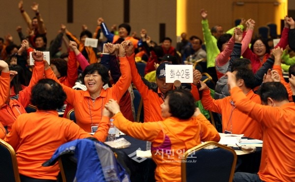 인천 동구는 지난 28~29일 이틀간 강원 고성군에 위치한 설악 델피노 리조트에서 ‘2016년 오피니언리더 역량강화 워크숍’을 개최했다. 사진은 워크숍 참가자들이 레크리에이션을 진행하며 즐거워하고 있는 모습.(사진제공=인천 동구청)