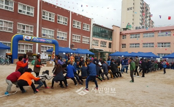 지난 29일 경기 안성시 안성1동은 명륜여자중학교 운동장에서 '제8회 동민 한마음 체육대회'를 개최했다. 사진은 체육대회 참가자들이 줄다리기 경기를 펼치고 있는 모습.(사진제공=안성시청)
