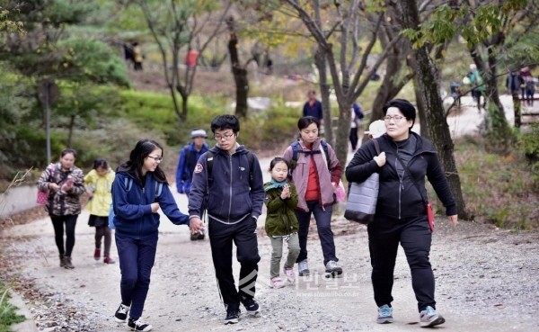 최근 충남 아산시 도고온천초등학교는 '부모님과 함께하는 아산 명산 등반대회'를 실시했다. 사진은 참가한 부모와 학생들이 열심히 산을 오르는 모습.(사진제공=아산교육지원청)