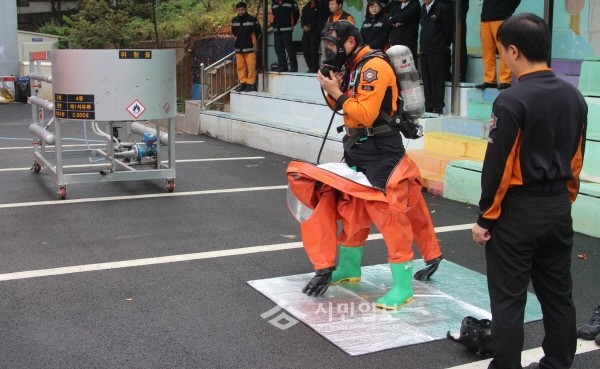 31일 경기 부천소방서는 구조대 훈련장에서 '2016년 소방전술경연대회 시연회'를 개최했다. 사진은 시연회에서 소방관이 화학보호복을 착용하는 훈련을 하는 모습.(사진제공=부천소방서)