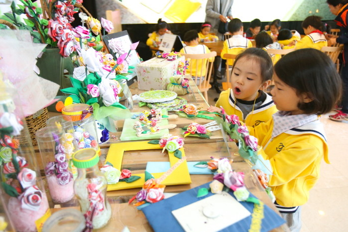 최근 서초구청 1층에서 한국업사이클디자인협회소속 11개 브랜드와 두바퀴희망자전거, 서초지역자활센터 업사이클링 사업단 등이 만든 제품들이 전시된 '제1회 서초 업사이클 전시회 다시보기展(전)'을 방문한 어린이들이 작품을 구경하고 있다. (사진제공=서초구청)