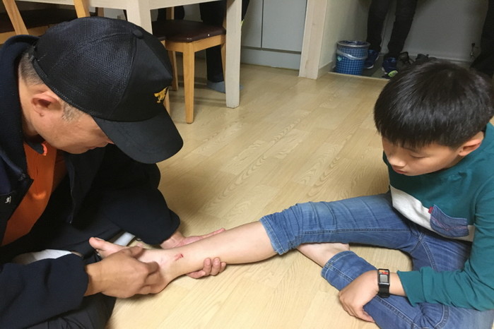 최근 은평소방서 속초에서 2박3일간의 일정으로 진행되는 은평초등학교 소규모 테마 여행에 구조대원 2명이 동행했다. 사진은 구조대원이 학생의 다리에 난 상처를 치료하는 모습.(사진제공=은평소방서)