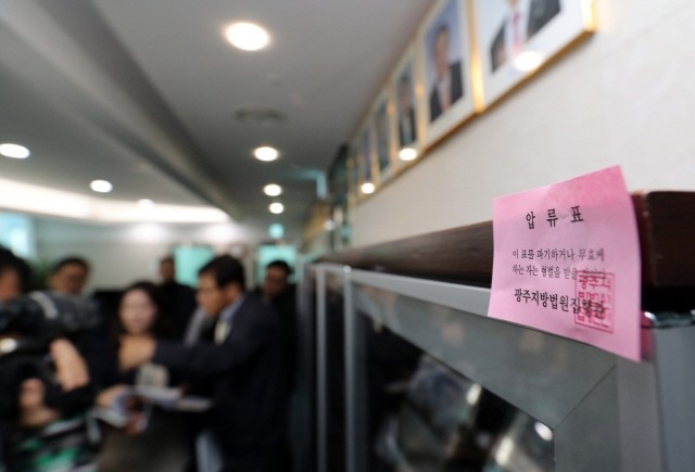 31일 오전 전남 나주시 광주·전남공동혁신도시 내 한국농수산식품유통공사(aT)에 공공기관으로서는 이례적으로 광주지방법원 집행관이 가압류 딱지를 붙이고 있다. aT는 중국업체에 13억원을 선수금을 떼인 국내 무역업체가 aT를 상대로 대금 지급을 요구하는 1심 민사소송에서 최근 폐소했다.