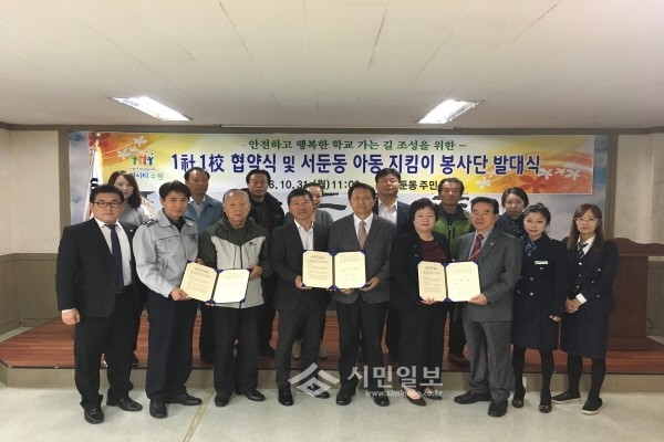 지난 31일 경기 수원시 권선구 서둔동은 서호초등학교와 학생들의 안전한 등하굣길 조성을 위한 '1社1校 협약식' 및 '서둔동 아동지킴이 봉사단 발대식'을 개최했다. 사진은 관계자들이 기념촬영하는 모습.(사진제공=권선구청)