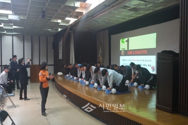 최근 서울 영등포소방서는 여의도동 소재 여의도우체국에서 직원을 대상으로 '소방안전교육'을 실시했다. 사진은 우체국 직원들이 심폐소생술 실습을 하는 모습.(사진제공=영등포소방서)