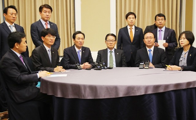 국정농단을 주도한 ‘비선실세’로 주목된 최순실씨가 검찰에 긴급체포 돼 조사를 계속받고 있는 1일 오전 야당 원내대표들이 후속 대책 마련을 위해 국회에서 만나 발언하고 있다. (왼쪽 세 번째부터) 더불어민주당 우상호 원내대표, 국민의당 박지원 비상대책위원장 겸 원내대표, 정의당 노회찬 원내대표.