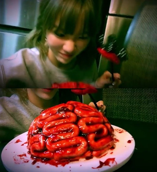 해당 영상 속에는 태연이 뇌 모양의 케이크를 감상하는 모습이 담겨 있어 눈길을 끌었다.