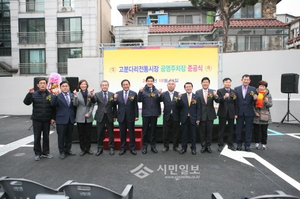 지난 31일 서울 강동구 고분다리전통시장 옆에 65억원의 예산을 투입해 건립된 공영주차장에서 ‘고분다리전통시장 공영주차장 준공식’이 개최됐다. 사진은 준공식 후 이해식 구청장(왼쪽 여섯 번째)과 구의원들이 기념촬영하는 모습.(사진제공=강동구청)