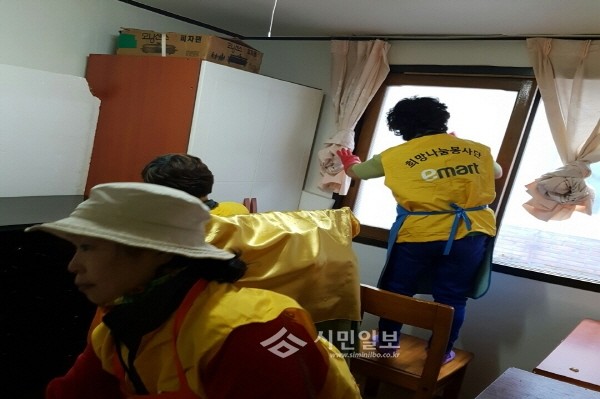 지난 1일 서울 도봉구는 이마트 창동점 주부봉사단과 임직원 15명이 참여해 '희망마을 만들기 사업'의 일환으로 '지역내 저소득층 집수리 자원봉사 활동'을 실시했다. 사진은 봉사단원들이 집안 청소를 하는 모습.(사진제공=도봉구청)
