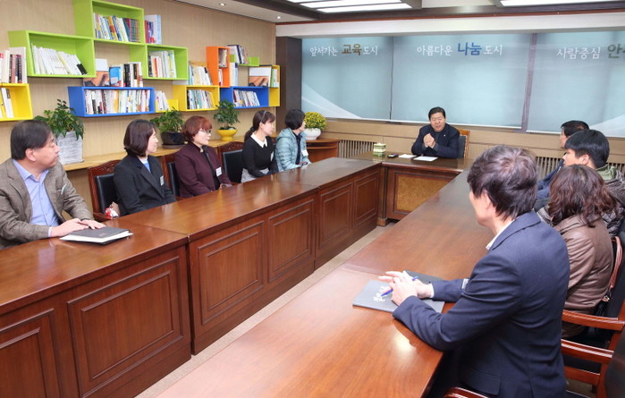 지난 1일 영등포구는 구청 열린사랑방에서 '시간선택제·임기제 공무원 간담회'를 개최했다. 사진은 조길형 구청장(가운데)과 관계자들이 간담회를 진행하며 이야기를 나누고 있는 모습.(사진제공=영등포구청)