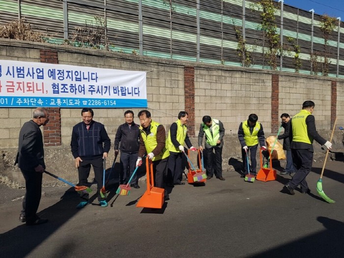 지난 1일 서울 성동구는 마장동 소규모재생사업의 성공적 추진을 기원하기 위해 주민과 상인 50여명과 함께 마장축산물시장 대청소를 실시했다. 사진은 참가자들이 거리 청소를 하고 있는 모습.(사진제공=성동구청)