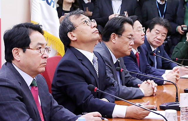 새누리당 이정현 대표(왼쪽 두 번째)와 정진석 원내대표가 2일 오전 서울 여의도 당사에서 열린 최고위원·중진의원 연석 간담회에서 의원들의 발언을 듣고 있다.