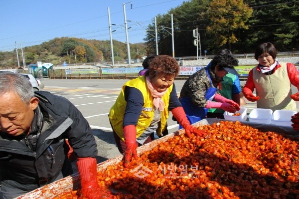 최근 경기 양평군 양동면 행복돌봄추진단은 ‘행복나눔 깍두기 담그기’ 행사를 열어 담근 깍두기를 지역내 저소득 노인 100가구에 전달했다. 사진은 관계자들이 깍두기를 양념에 무치는 모습.(사진제공=양평군청)