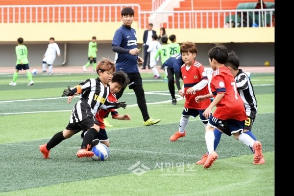 최근 경기 광주시는 광주공설운동장에서 지역내 15개 초등학교 2~4학년 학생과 학부모 등 200여명이 참석한 가운데 '제6회 체육회장기 초등부 저학년 축구대회'를 성황리에 개최했다. 사진은 대회에 참가한 학생들이 공을 다투는 모습.(사진제공=광주시청)