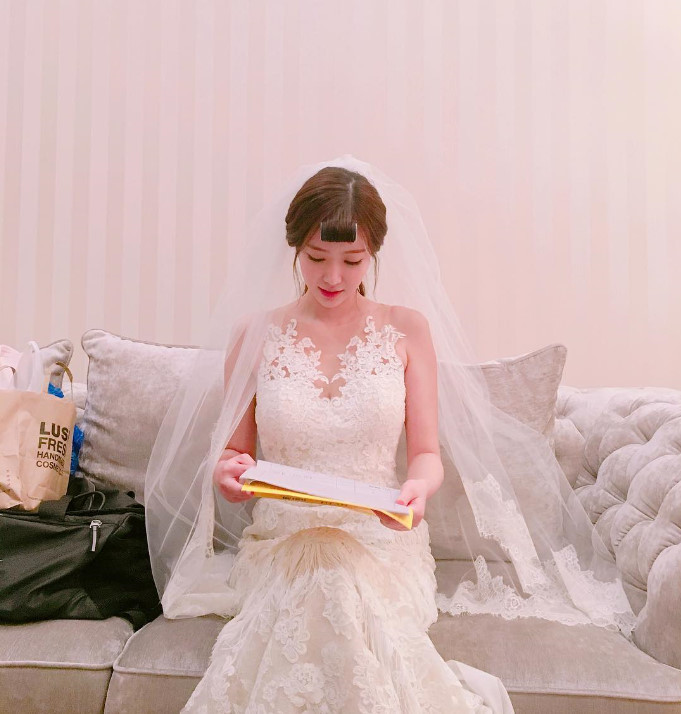 공개된 사진 속 그는 웨딩드레스를 입고 헤어롤을 한 채 종이를 쳐다보고 있다. 어여쁜 모습이 눈길을 끈다.