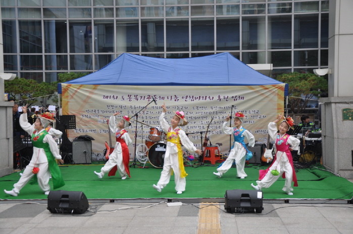 최근 도봉구는 구청 앞마당에서 지역내 40여개 기업체가 참여한 가운데 ‘제1회 도봉복지공동체 나눔 연합바자회’를 개최했다. 사진은 어린이 무용단원들이 전통 공연을 선보이는 모습.(사진제공=도봉구청)