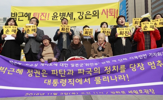 김복동 할머니를 비롯한 일본군 '위안부' 피해 할머니들과 관련 단체 관계자들이 3일 오전 서울 광화문광장에서 열린 '박근혜-최순실 게이트에 대한 일본군 위안부 관련 제 단체 시국선언' 기자회견에서 구호를 외치고 있다.