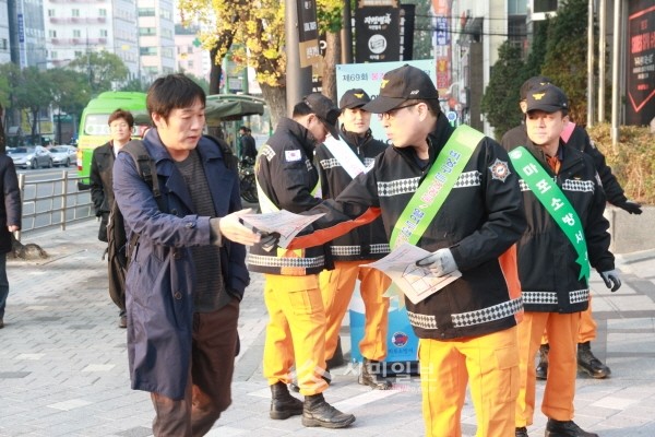 지난 3일 서울 마포소방서는 노고산동에 위치한 신촌역에서 불조심 화재예방 캠페인을 실시했다. 사진은 소방서 관계자들이 시민들에게 화재예방 홍보 전단물을 배부하는 모습.(사진제공=마포소방서)