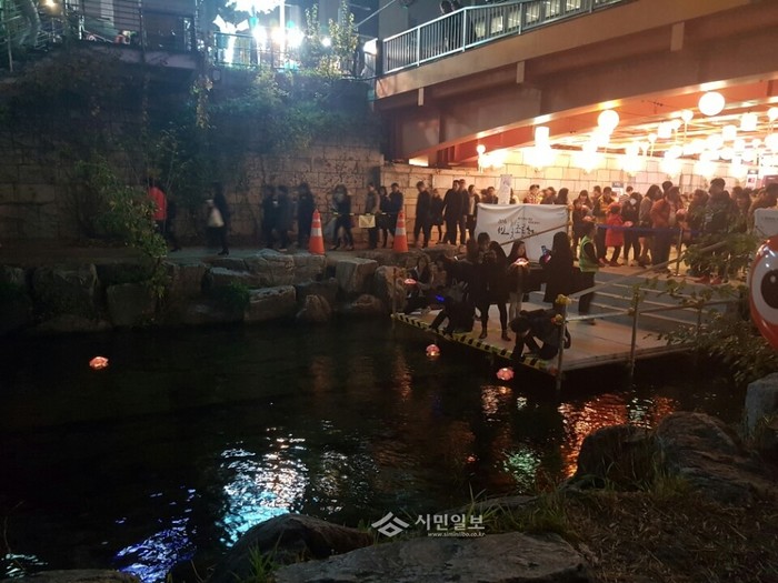 [시민일보=이대우 기자]서울 종로구 청계천에서 열린 '2016 서울 빛초롱 축제' 에서 사람들이 등불에 소원을 적어 불을 붙인 등불을 청계천에 띄우고 있다.