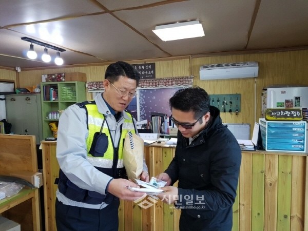 지난 4일 충남 아산경찰서는 교통사고 예방을 위해 화물차량 및 승합차량 운전자 대상 홍보 활동을 실시했다. 사진은 경찰관이 운전자에게 홍보물품을 배부하는 모습