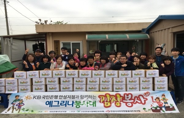 최근 경기 안성시 서부무한돌봄네트워크팀에서 KB국민은행 안성지점의 후원으로 진행한 ‘예그리나봉사대 김장봉사’ 행사가 성황리에 마무리됐다. 사진은 행사 참가자들이 기념촬영하는 모습.(사진제공=안성시청)