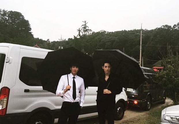 사진 속 두 사람은 촬영장에서 비가 오는 날 검은색 우산을 쓰고 카메라를 응시하고 있었다.