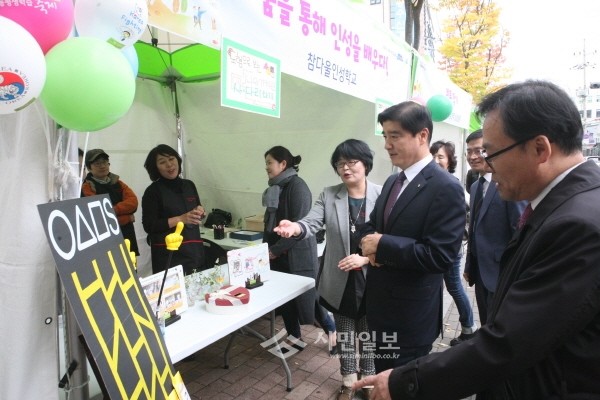 최근 서울 강동구는 명일동 강동구평생학습관에서 '강동교육 박람회'를 개최했다. 사진은 행사에 참석한 이해식 구청장(가운데)이 체험 부스를 둘러보는 모습. (사진제공=강동구청)