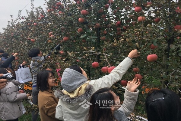 최근 경기 포천시농업기술센터는 서울대학교 원예생명공학과 학생 72명을 대상으로 '내가 찾은 포천'이란 주제로 '포천팜투어'를 실시했다. 사진은 팜투어 참가자들이 '사과 수확 체험'을 하고 있는 모습.(사진제공=포천시청)