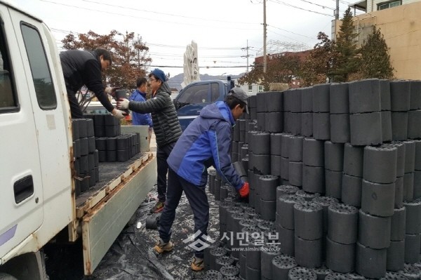지난 6일 경기 포천시 영북면에서 저소득 가정에 연탄과 쌀을 전달하는 사랑의 연탄 나눔 행사가 열렸다. 사진은 이날 행사 참여자들이 열심히 연탄을 나르는 모습.(사진제공=포천시청)