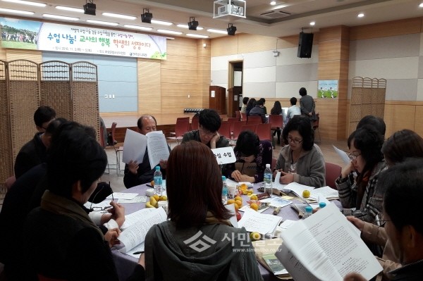 최근 전남도교육청은 보성군청소년수련원에서 도내 350여명의 교사들이 참여한 가운데 '수업 나눔 장터'를 개최했다. 사진은 행사에 참여한 교사들이 회의하는 모습.(사진제공=전남도교육청)
