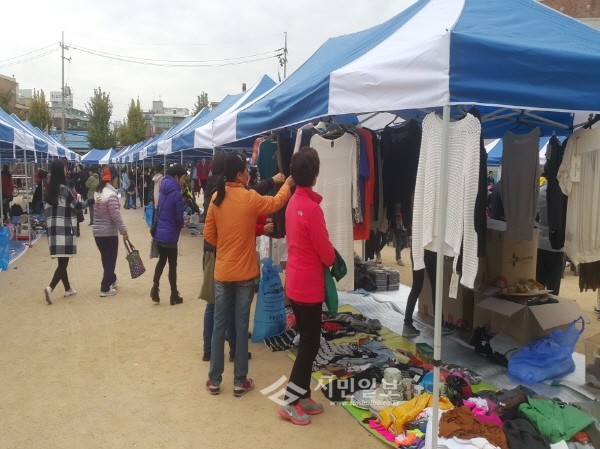 최근 서울 도봉구 쌍문3동 신도봉중학교 운동장에서 '제3회 우리마을축제 둘리장터'가 성황리에 개최됐다. 사진은 행사장을 방문한 주민들이 벼룩시장에 진열된 의류들을 살펴보는 모습.(사진제공=도봉구청)