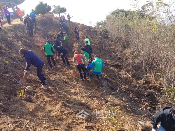 최근 경북 구미시 고아읍에서는 접성산 정상(대황정 주변)에 기관단체회원, 지역주민, 직원 등 100여명이 참석한 가운데 단풍나무 200주와 영산홍 500주를 식재했다. 사진은 참여자들이 나무를 심는 모습.(사진제공=구미시청)