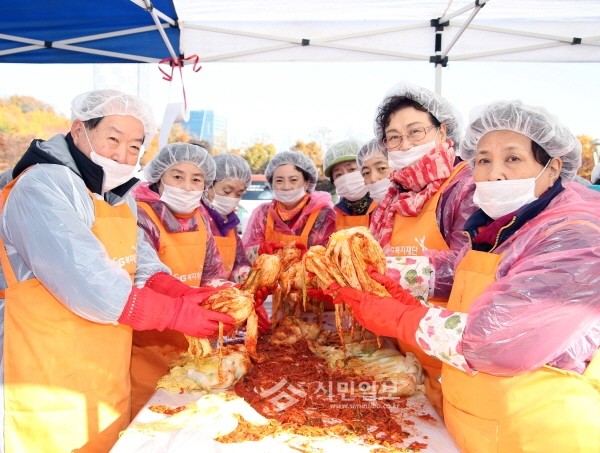9일 박홍섭 서울 마포구청장(왼쪽)이 상암동 월드컵경기장 북측광장에서 열린 'KT&G 복지재단과 함께하는 2016 마포구 사랑의 김장나눔 릴레이'에 참석해 자원봉사자들과 함께 김장을 담그고 있다.(사진제공=마포구청)