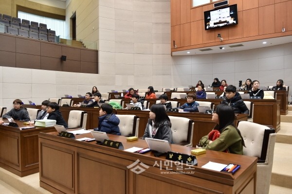 의장 역할을 맡은 전윤서 학생은 “회의를 진행해보니 긴장되기도 하고 재밌었다. 조례가 만들어지는 과정과 의원과 공무원이 어떤 일을 하는지 구체적으로 알 수 있었던 시간이 돼 뜻깊다”고 말했다.