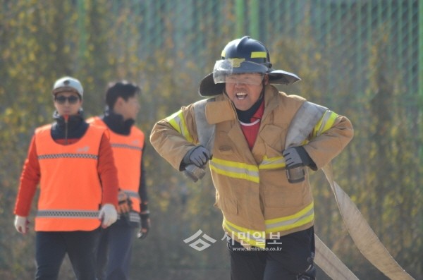 지난 8일 서울 강남소방서는 탄천물 재생센터 운동장에서 직원 및 의용소방대원 250여명이 참석한 가운데 의용소방대 소방기술경연대회를 개최했다. 사진은 소방호스 끌기 릴레이에 참여한 소방관이 달리는 모습.(사진제공=강남소방서)