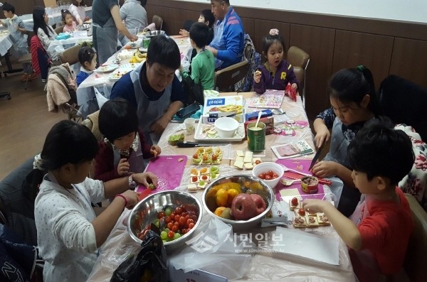 최근 서울 금천구 시흥1동 주민센터는 구 건강가정지원센터와 함께 16가정·40여명이 참여하는 '떴다 우리마을 요리사' 행사를 개최했다. 사진은 참여한 가족들이 열심히 음식을 만드는 모습.(사진제공=금천구청)