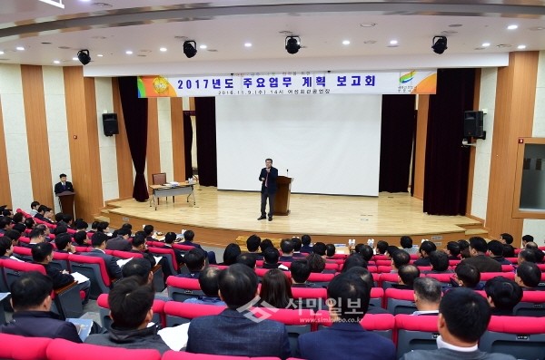 지난 9일 경기 여주시는 여성회관 공연장에서 원경희 시장과 각 부서장이 참석한 가운데 '2017년 주요업무 계획 보고회'를 개최했다. 사진은 원 시장이 사업계획에 대한 총평을 하는 모습.(사진제공=여주시청)