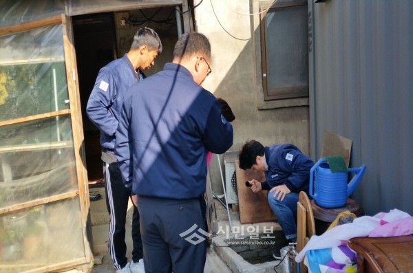 지난 9일 경기 오산시 초평동과 (주)대림제지는 민·관 협력사업으로 지역내 저소득 노인부부 가정을 방문해 '파랑새 든~든해' 주거환경 개선사업을 실시했다. 사진은 관계자들이 수도시설을 살펴보는 모습.(사진제공=오산시청)