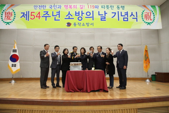 지난 9일 서울 동작소방서는 3층 강당에서 나경원 국회의원(가운데), 최영수·김혜련·유용 서울시의원, 전갑봉·유태철·김주은 동작구의원 등 소방공무원과 의용소방대원 200여명이 참석한 가운데 '제54주년 소방의 날 기념행사'를 개최했다.(사진제공=동작소방서)