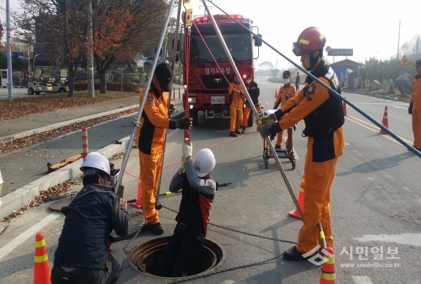 14일 경기 여주소방서는 여주시 연양동 인근에서 맨홀 특수사고 발생시 현장대응 능력을 강화하기 위해 119구조구급대원들이 맨홀 등 밀폐 공간 구조 소방훈련을 실시했다.(사진제공=여주소방서)
