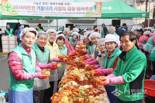 14일 김정호 경기 광명시의회 부의장을 비롯한 7명의 의원들이 광명7동 주민센터에서 개최된 '2016 새마을 사랑의 김장 담아주기'행사에 참석해 봉사원들과 함께 김장을 담궜다. 사진은 의원들이 기념촬영하는 모습.(사진제공=광명시의회)