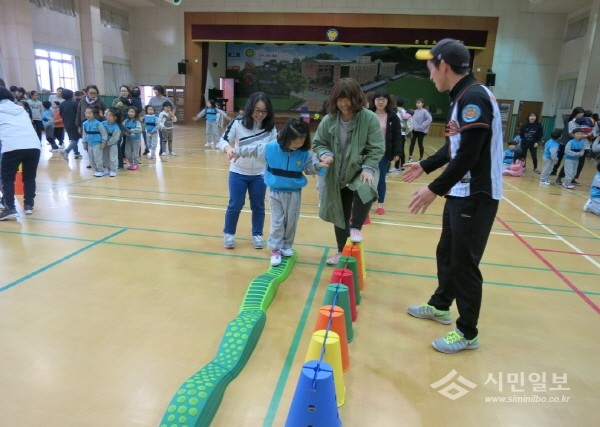 경북 구미시 문장초등학교 병설유치원은 최근 학교 강당에서 방과후 특별활동 학부모 참여수업을 실시했다. 사진은 학부모와 아이가 징검다리 건너기 미션을 수행하고 있는 모습.(사진제공=문장초등학교병설유치원)