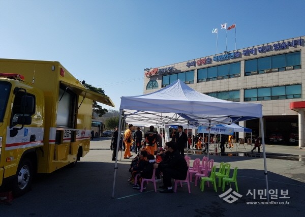 최근 경기 안성소방서는 ‘119안전체험 한마당 행사’를 마련해 눈높이 맞춤형 체험교육을 실시했다. 사진은 체험 한마당에 참여한 가족들이 긴급구조통제단 차량 앞에서 교육 동영상을 시청하는 모습.(사진제공=안성소방서)