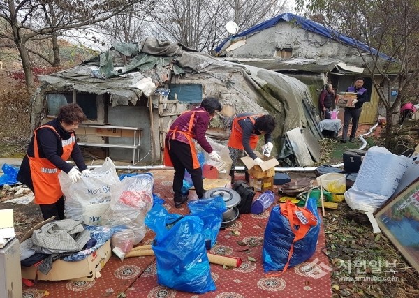 최근 경기 포천시 소흘읍사무소 맞춤형복지팀과 남부희망복지센터는 가나다봉사회의 지원으로 소흘읍 홀몸노인을 위한 사랑의 청소서비스를 펼쳤다. 사진은 관계자들이 폐기물을 정리하는 모습.(사진제공=포천시청)