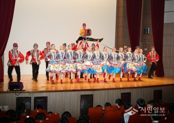 지난 14일 서울 마포구는 지역주민에게 국제문화공연 관람의 기회를 제공하고자 러시아 히바로브스크에서 활동 중인 '고렝카 무용단'을 초청해 구청 대강당에서 공연을 열었다. 사진은 무용단원들이 러시아 전통무용을 선보이는 모습.(사진제공=마포구청)
