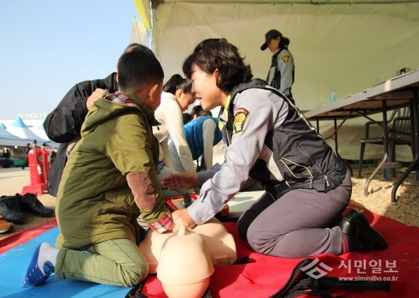 최근 경기 화성소방서는 '2016 화성 햇살드리 행사'에 참가해 '소소심 체험장'을 운영했다. 사진은 소방서 관계자가 어린이에게 '심폐소생술 교육'을 하는 모습.(사진제공=화성소방서)
